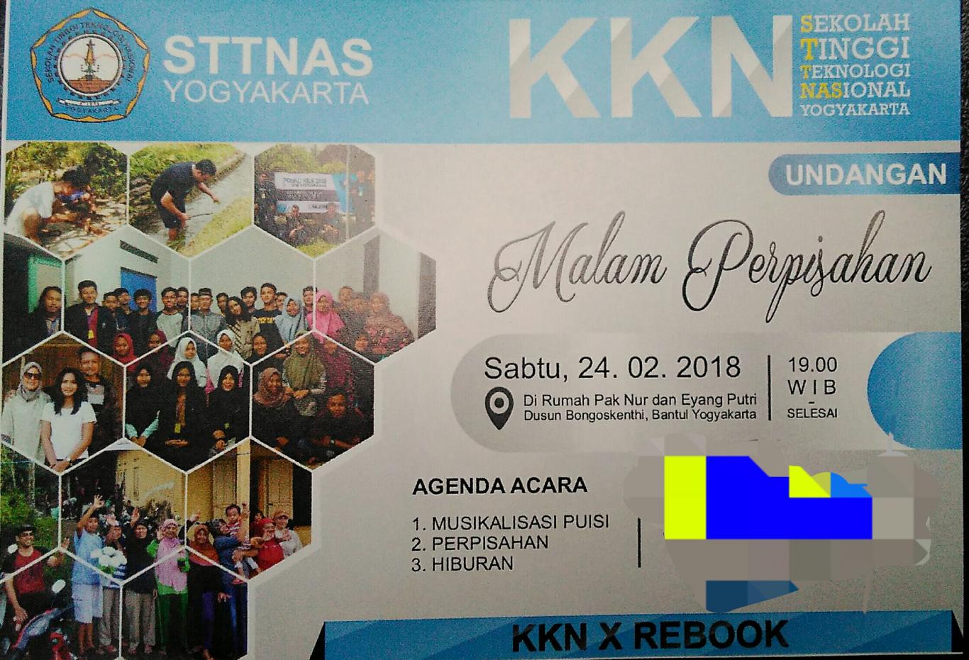 Bongoskenti- Tak terasa satu bulan sudah KKN X STTNAS Yogyakarta berada di Pedukuhan Bongoskenti. Banyak Program Kegiatan yang dilaksanakan oleh KKN. Ada perkenalan tentu ada perpisahan. KKN X REBOOK Bongoskenti akan mengadakan Malam Perpisahan, kegiatan akan digelar malam Minggu 24 Februari 2018. Semoga menginspirasi warga Bongoskenti. (Ars)