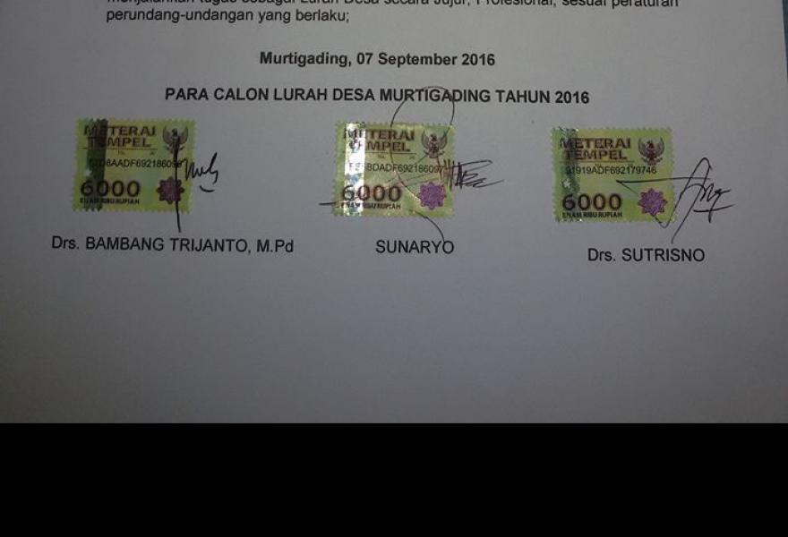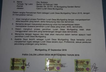 Murtigading_ Dihadiri oleh Muspika, Babinsa_Babinkamtibmas, BPD Desa Murtigading, Panitia Sembilan, dan Tokoh Masyarakat, Calon Lurah Desa Murtigading mengambil nomor urut untuk PilurDes Desa Murtigading. Selain mengambil Nomor Urut Calon Lurah juga menandatangani Pakta Integritas Calon Lurah Desa Murtigading. Kegiatan tersebut dilanjutkan Pembekalan dari Camat Sanden Bpk. Drs. Fatoni.