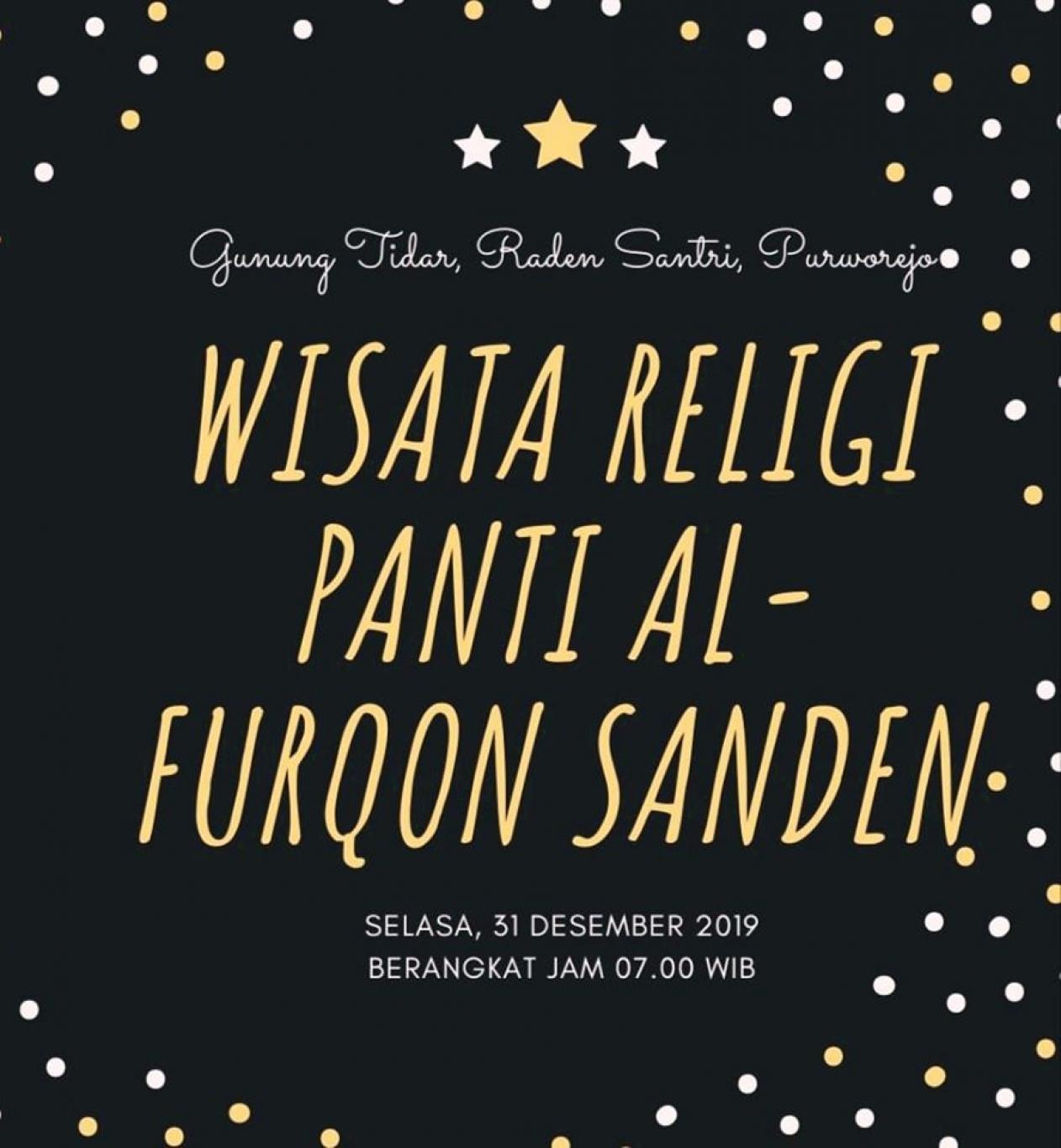 Murtigading - Panti Asuhan Yatim Piatu Fakir Miskin Al-Furqon Sanden akan menyelengarakan Wisata Religi pada Selasa, 31 Desember 2019, Berangkat Jam 07.00 Wib. Adapun tujuannya adalah obyek wisata: Gunung Tidar, Gunung Santri, Bale Dana Purwareja. #rais
