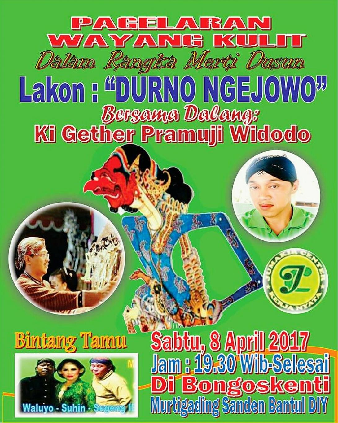 Bongoskenti Murtigading – Dalam rangka Merti Dusun, warga Pedukuhan Bongoskenti Murtigading Sanden akan mengadakan Pengajian dan Pagelaran Wayang Kulit. Kegiatan ini akan dilaksanakan hari Sabtu (8/4) dengan dalang kondang Ki Gether Pramuji Widodo dari Yogyakarta.