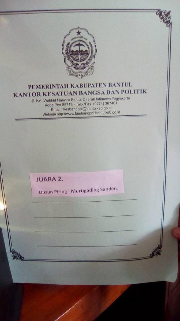 Bantul_ Piring I memperoleh Juara II Lomba Jaga Warga Tingkat Kabupaten Bantul. Penyerahan hadiah lomba jaga warga tingkat Kabupaten Bantul di Kantor Kesatuan Bangsa Dan Politik jl.Wachid Hasyim Sumuran. Hadir pada penyerahan hadiah ini Dandim Bantul , Kapolres Bantul, Camat, lurah, dukuh serta ketua jaga warga yg masuk 6 besar. Adapun kriteria penilaian diantaranya, keamanan masyarakat, potensi yang dapat digali, kesejahteraan masyarakat, ada skep dari Desa/Lurah dan pengerahan masyarakat pada saat penilaian. Itulah evaluasi yg disampaikan oleh wakil dari tim Juri. Dukuh Piring I (Yani Sunanto) mengatakan Kami haturkan terima kasih kepada masyarakat Pedukuhan Piring 1 atas kerjasamanya, kekompakannya, gotong royongnya, semangatnya, perjuangannya sehingga dapat meraih juara 2. Tak lupa kami haturkan terima kasih kepada Camat, Kapolsek beserta jajarannya, Danramil beserta jajarannya, pemerintah desa murtigading atas dukungan, bimbingan, motivasi dan segalanya sehingga kami dapat meraih hasil yg maksimal.(Tsabit)